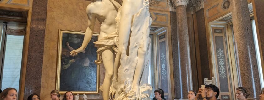 After talking about Caravaggio yesterday, today we went to see a number of his paintings at Sant’ Agostino, San Luigi dei Francesi, Santa Maria del Popolo, and the Galleria Borghese. Whew! And last week we saw the Caravaggio 2025 show, so we now have a lot of his paintings under our belts. And on the way we saw so many other great things today. In these pictures some Bernini and a couple of bookish paintings about curiosity (with stories from Herodotus and Apuleius). Also a detail from Dominichino’s Acteon painting (Caccia di Diana) in the Borghese, where the curious spectator gets caught in the act. #romeinstituteofliberalarts #sjc #uta